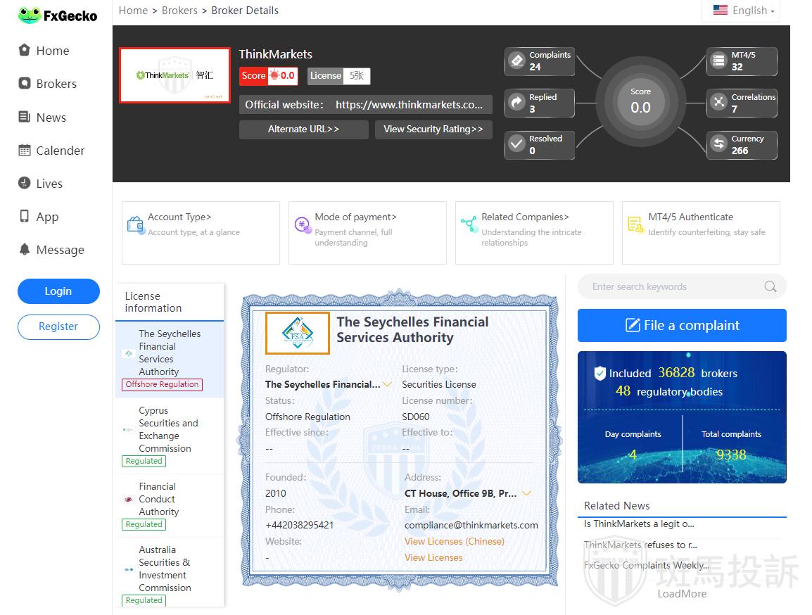 FTI has received 24 complaints about ThinkMarkets forex broker so far.