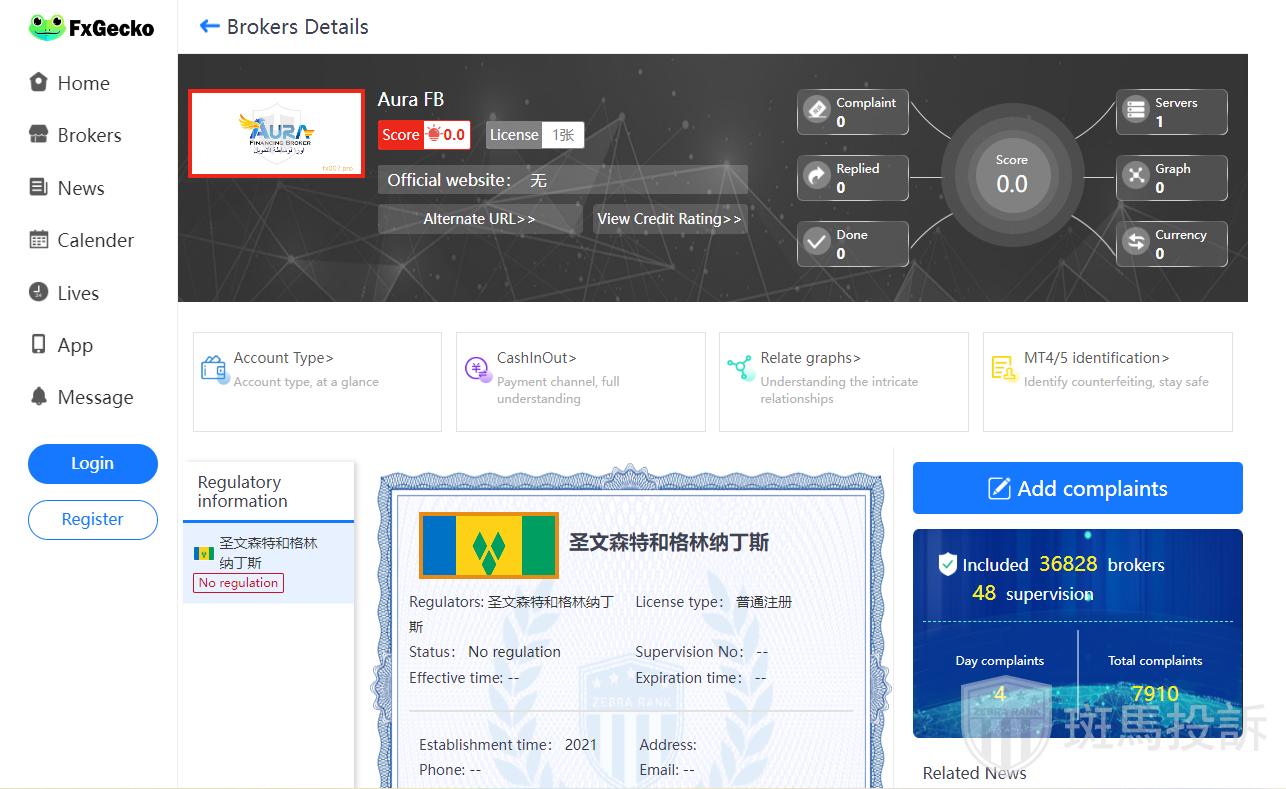 This broker is called Aura FB, which has been established for one year and ranks 3472 in the world. At present, there are 0 foreign exchange licenses, and the risk scan shows 1 risks. Investors need to pay attention to relevant risks.