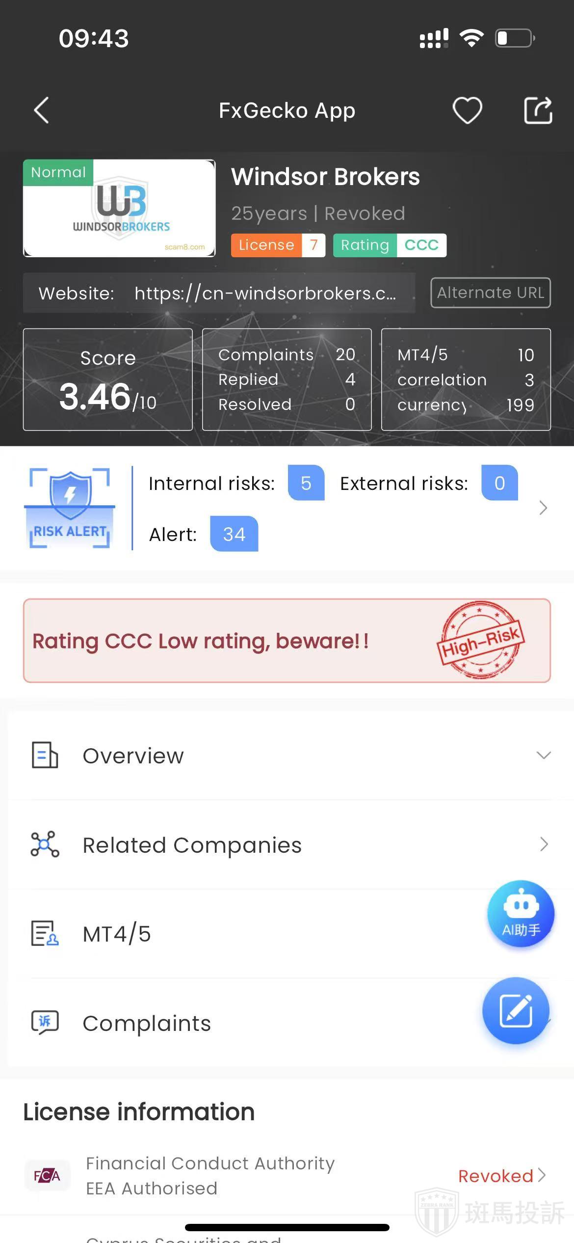 According to FTI's records, the platform named Windsor Brokers was established in 2000 and currently ranks 811th globally with a safety score of 60. The platform claims to hold regulatory licenses from seven countries, and there are 39 alerts from risk scans.