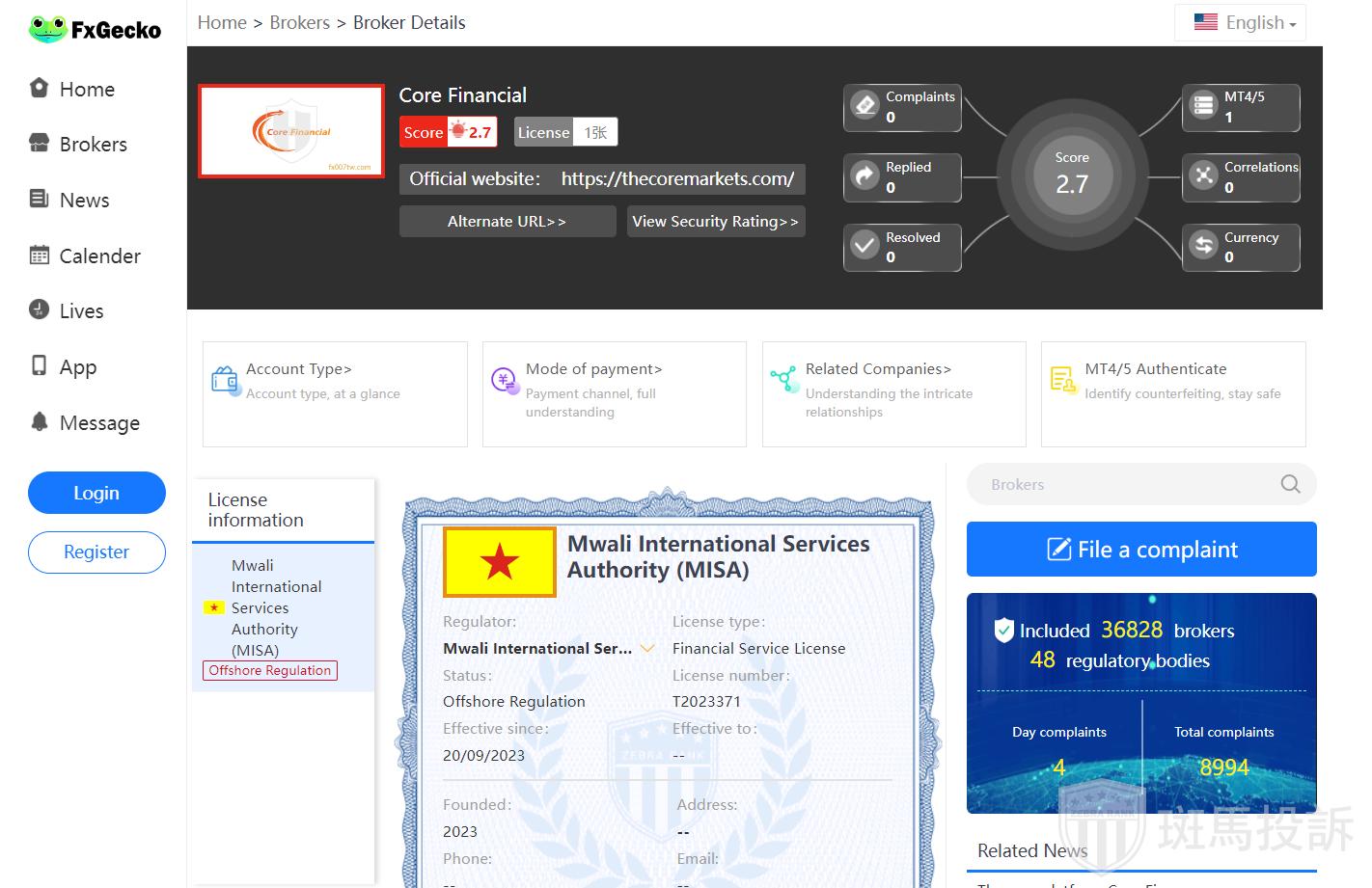 Currently, no valid regulatory information has been found for Core Financial, which is a high risk sign, beware!