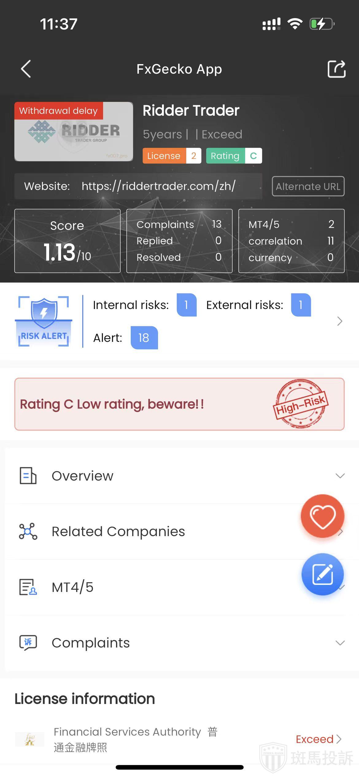 FTI’s inquiry reveals that Ridder Trader, established in 2020, ranks 5086 globally with a safety score of 40, claiming two regulatory licenses, and displaying 20 risk alerts upon a scan.