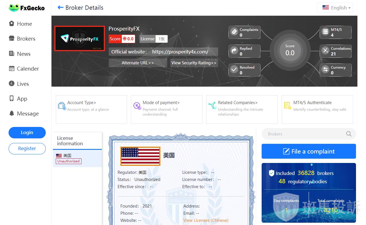 This broker is called ProsperityFX, which has been established for one year and ranks 3347 in the world. At present, there are 0 foreign exchange license, and the risk scan shows 5 risks. Investors need to pay attention to relevant risks.