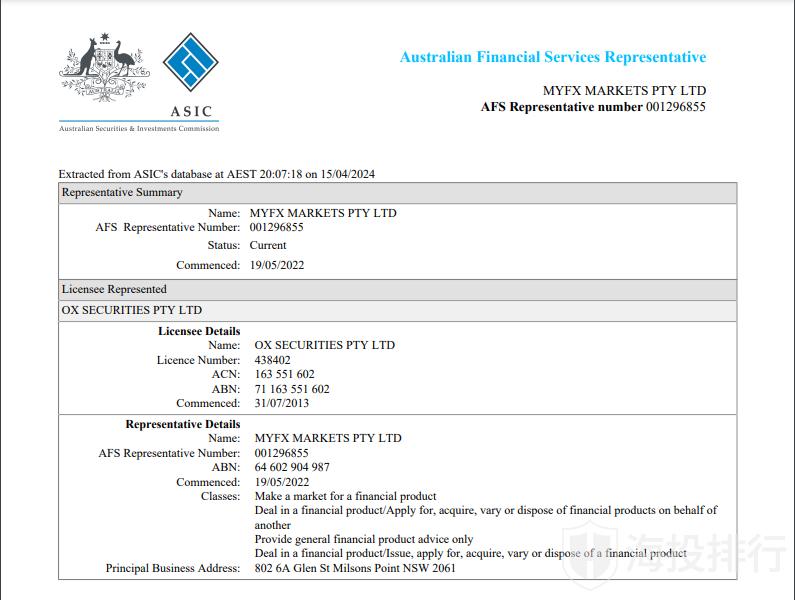 MYFX Markets is regulated by ASIC in Australia and has only obtained a Financial Services Licence with Regulatory Certificate number 001296855;