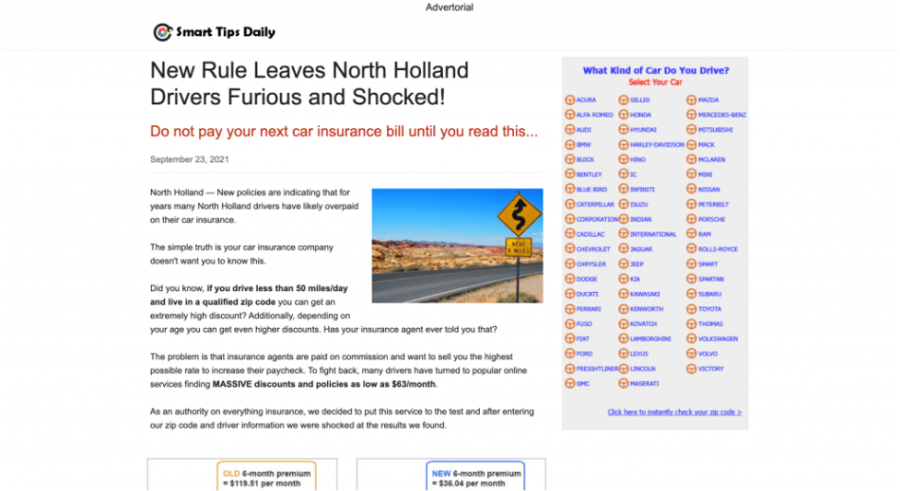 The attached phishing link takes you to a blog post about “new rule” on car insurance tips and prompts you to check your discount rate: