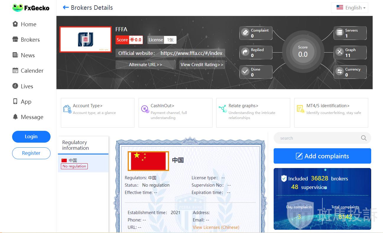 This broker is called FFFA, which has been established for one year and ranks 4136 in the world. At present, there are 0 foreign exchange license, and the risk scan shows 1 risk. Investors need to pay attention to relevant risks.