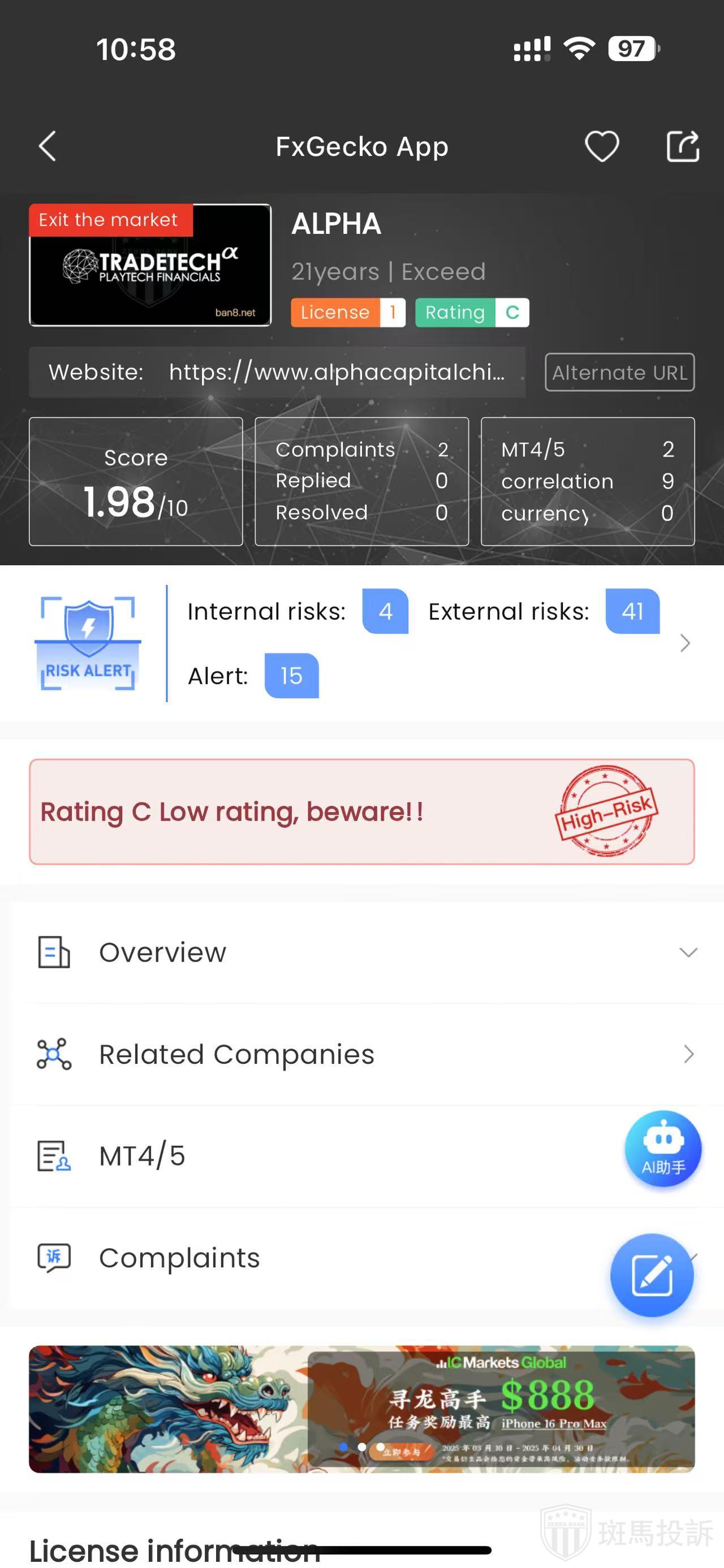 FTI Summary: Currently, ALPHA's official website indicates its exit from the Chinese market, with complaints mainly about withdrawal issues, leading to user dissatisfaction. There are numerous negative comments, and overall evaluations are average. Despite offering a wide range of trading products, complaint handling is relatively slow.