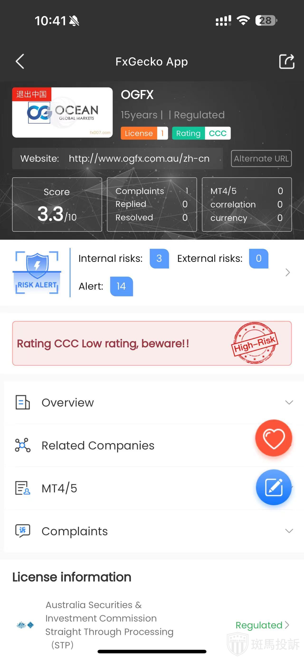 FTI risk warning shows that OGFX has 17 risks. Investors need to pay attention to the relevant risk alerts for this broker.