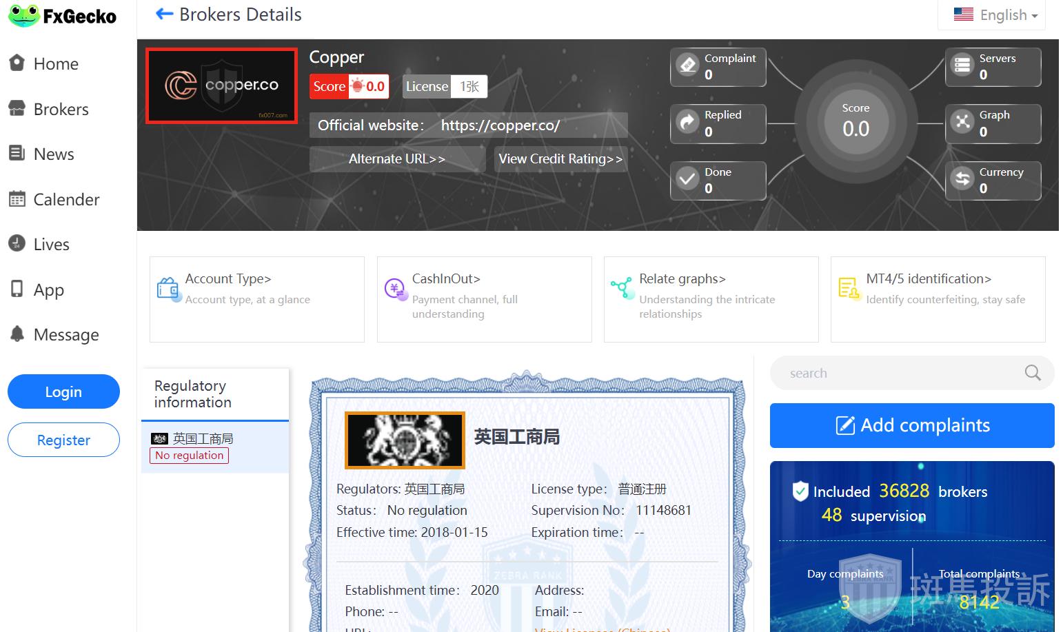 This broker is called Copper which was founded less than 3 year ago. At present, there are 0 legal licenses related to its business (This is a high risk signal, beware!), and the risk scan shows 21 risks. Investors need to pay attention to relevant risks.