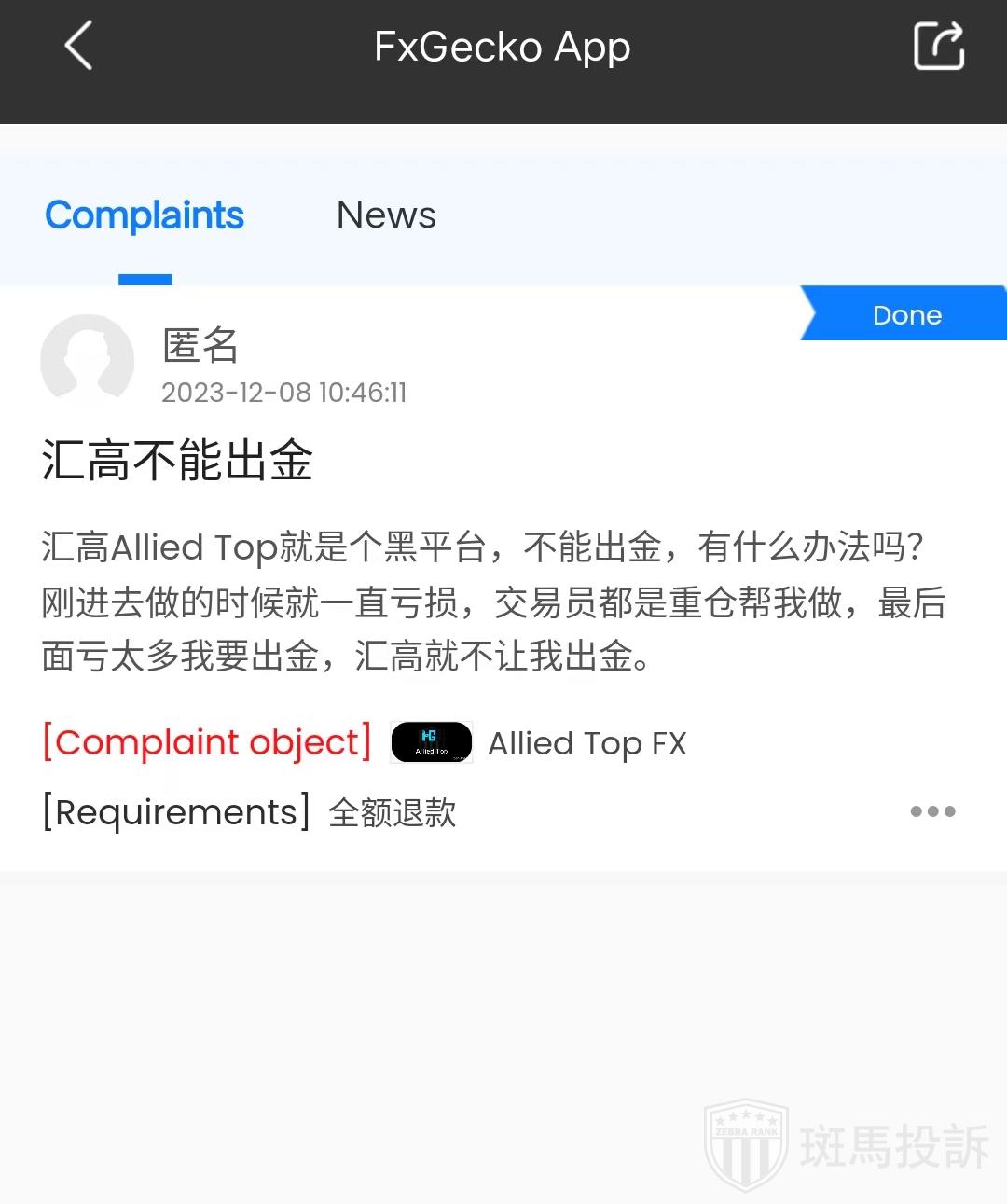 FTI has received 1 complaints about Allied Top FX forex broker so far.