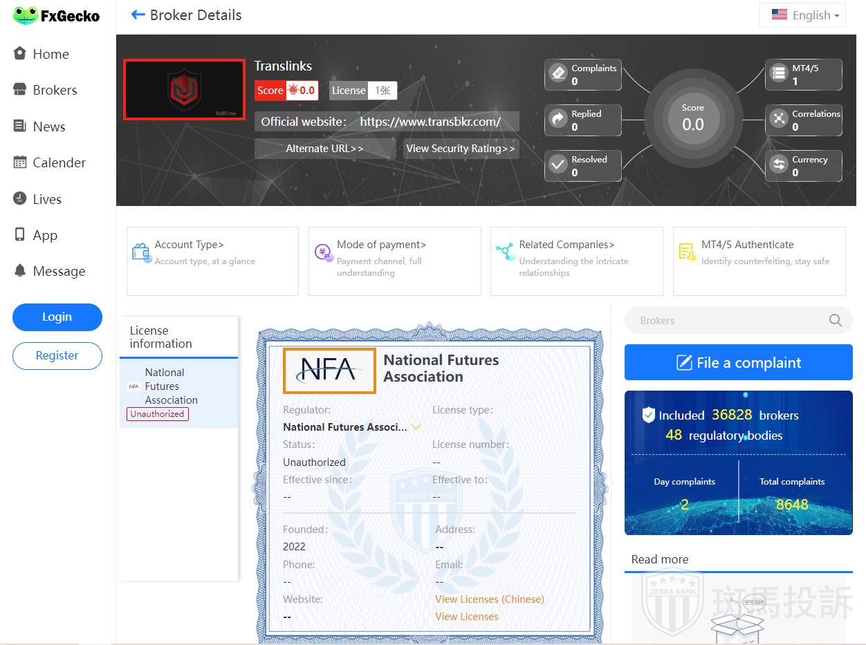 Currently, no valid regulatory information has been found for Translinks, which is a high risk sign, beware!