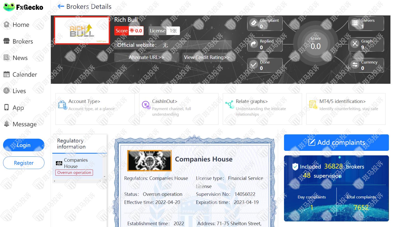 This broker is called Rich Bull which was founded less than 1 year ago and is ranked 2508 in the world. At present, there are 0 foreign exchange licenses, and the risk scan shows 2 risks. Investors need to pay attention to relevant risks.