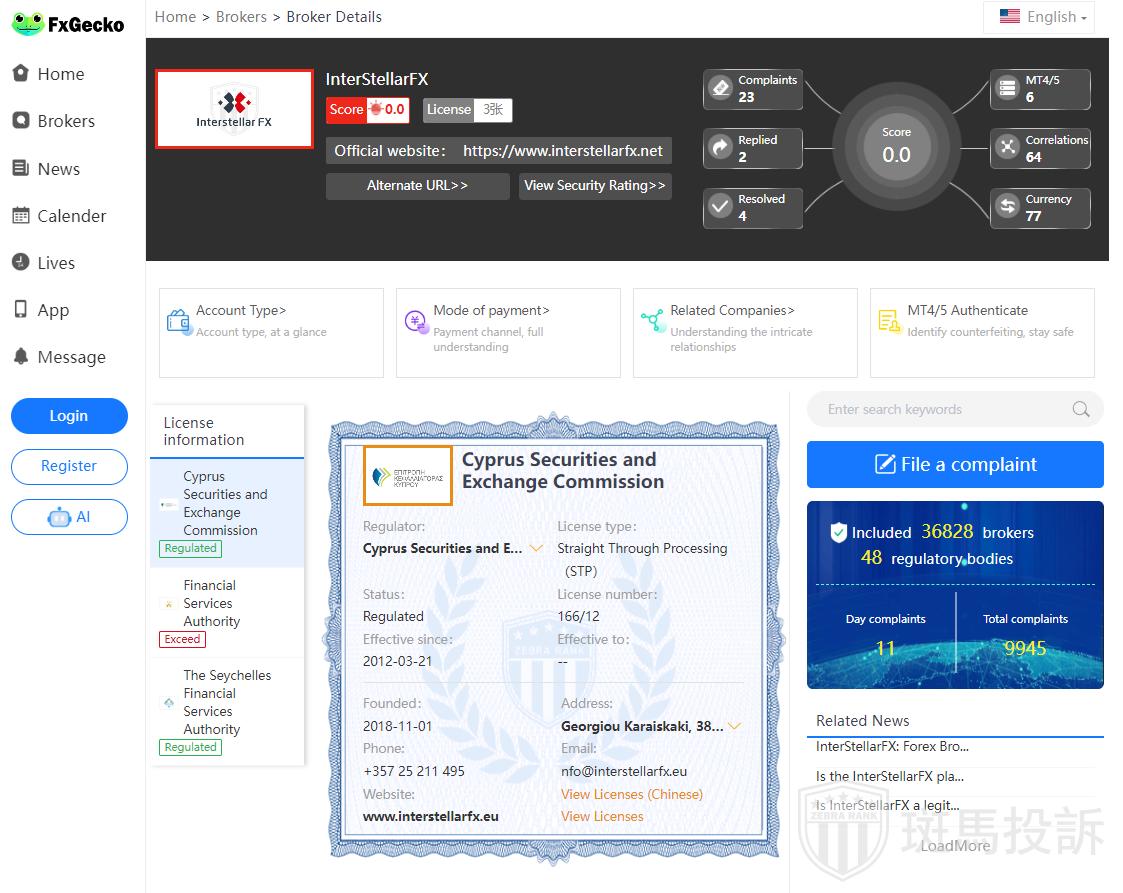 2. Regulatory Fraud:InterStellar Fx's regulatory information indicates that it holds a Cyprus regulatory licence, but in reality, the licensed company is not the same company as the company that corresponds to InterStellar Fx's MT4 account. This shows that InterStellar Fx has serious non-transparency and falsification in regulation, which further aggravates the risk for investors.