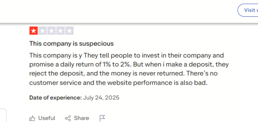 Another user warned, “They tell people to invest in their company and promise a daily return of 1% to 2%. But when I make a deposit, they reject the deposit, and the money is never returned.”