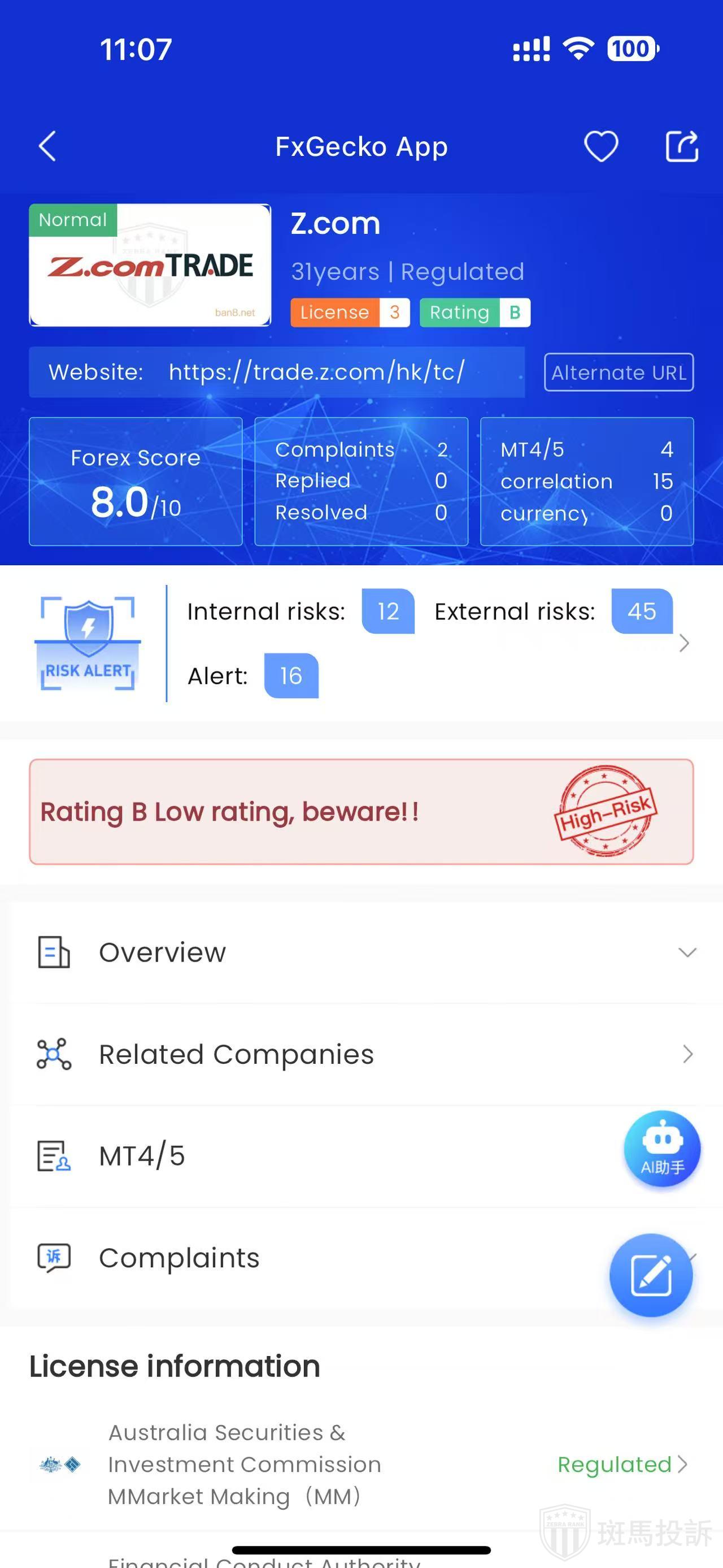 FTI's comprehensive review notes that Z.com's official website is currently operating normally, but there have been complaints concerning counterfeit versions of the platform, GMO Click Z.com, resulting in fraud. There are relatively few negative reviews, and overall comments from various sources are generally acceptable, with a wide range of trading instruments available, although complaint handling tends to be slower.