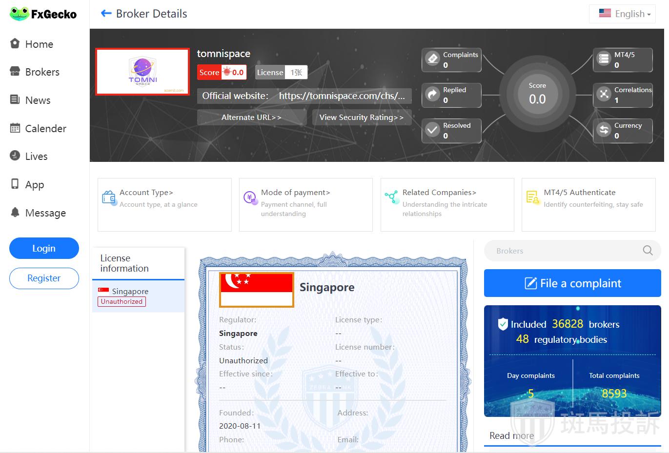 Currently, no valid regulatory information has been found for tomnispace, which is a high risk sign, beware!