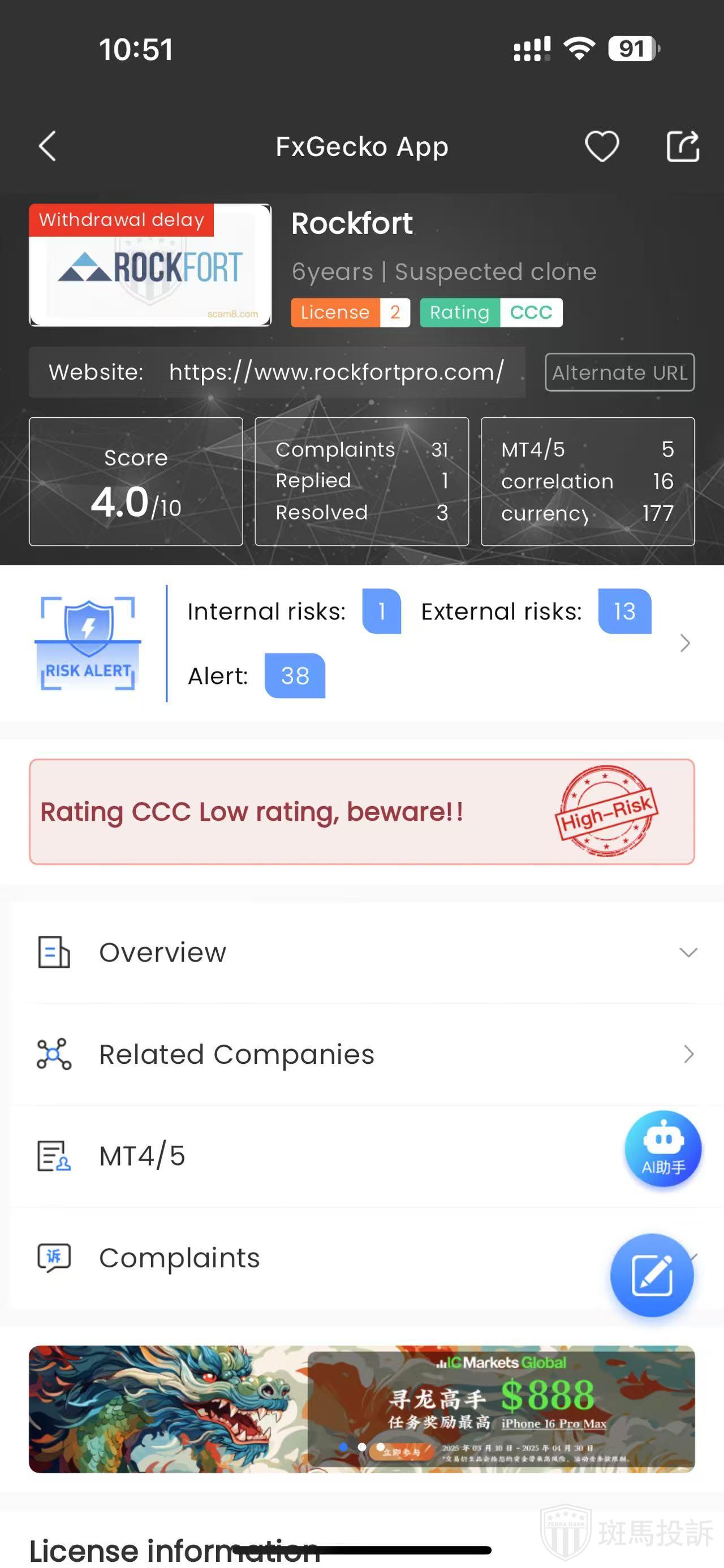 According to FTI, this platform named Rockfort was established in 2019, ranked globally at 840th place, with a safety score of 60, and claims to hold regulatory licenses from two countries, with 52 risk scan alerts. As a forex trading platform, Rockfort has gained some recognition within the industry and holds a Derivative Issuer (DI) license issued by the New Zealand Financial Markets Authority (FMA), indicating compliance with stringent financial regulations such as capital requirements, compliance checks, risk control mechanisms, and dispute resolution mechanisms.