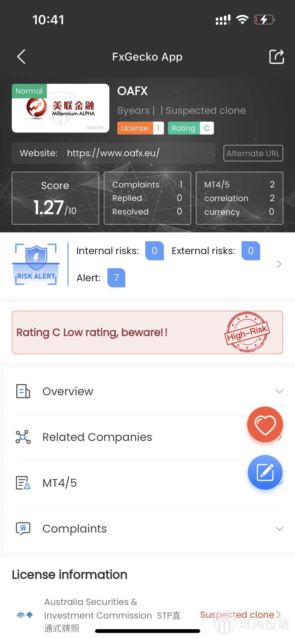 According to FTI's records, this platform is called OAFX, established in 2017, ranked globally at 4,662, with a safety score of 34. The platform claims to hold one forex license, and there are six risk scan warnings.