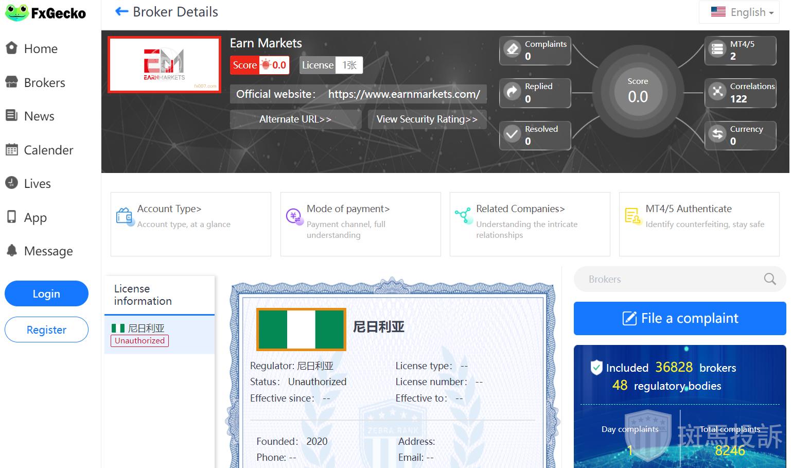 This broker is called Earn Markets which was founded less than 3 year ago and is ranked 3533 in the world. At present, there are 0 foreign exchange licenses (This is a high risk signal, beware!), and the risk scan shows 50 risks. Investors need to pay attention to relevant risks.