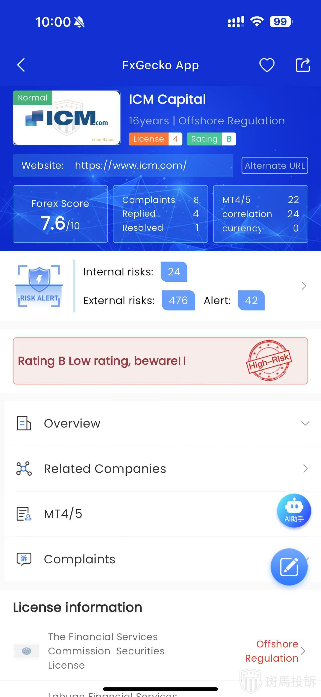 FTI Comprehensive Review: ICM Capital's official website is currently operating normally. Complaints generally arise from issues such as erroneous contract quotations or difficulties with withdrawals due to trading environment problems, which require attention. There is a relatively high amount of negative information, and overall comments from various parties are mixed. The platform offers a wide range of tradable assets but handles complaints at a slower pace.