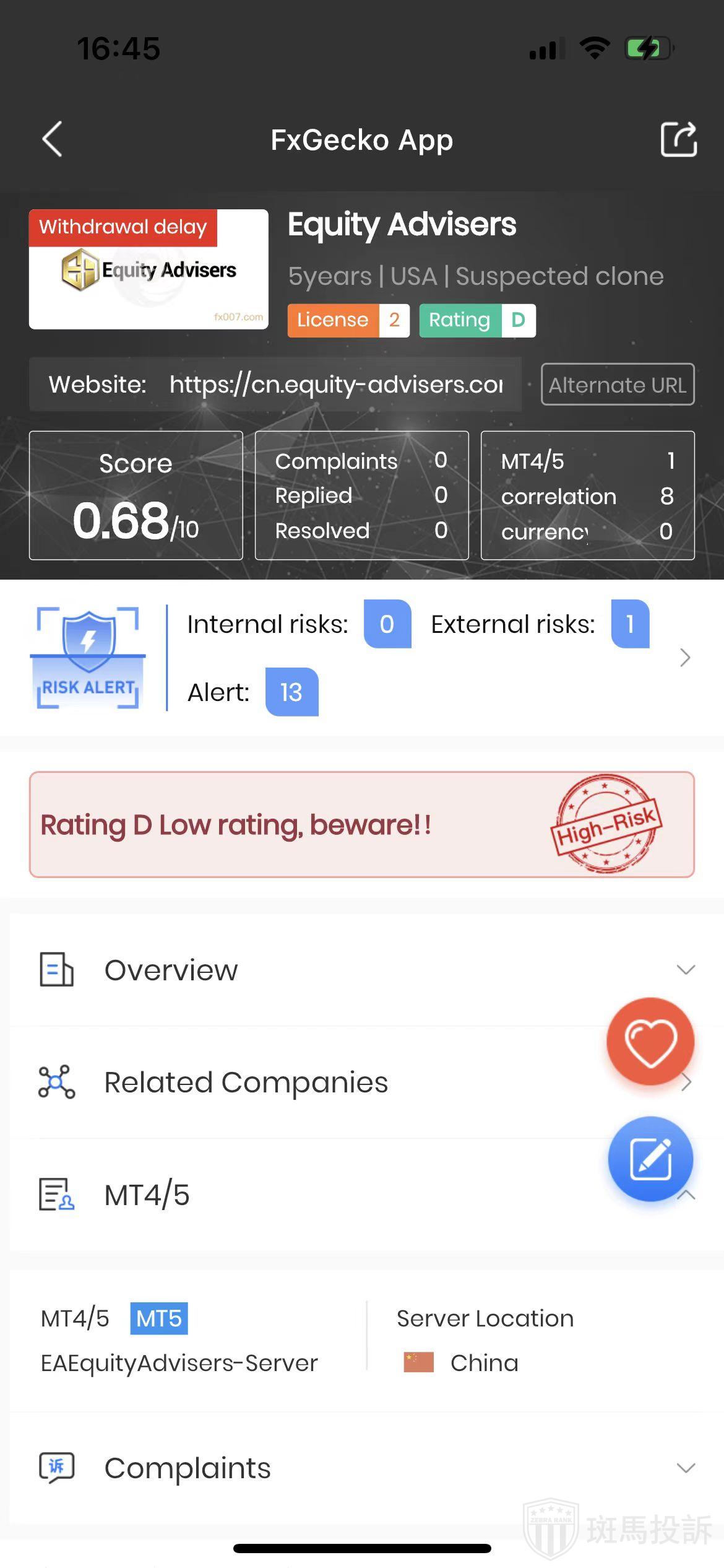 FTI risk warning shows that 亿澳Equity Advisers has 14 risks. Investors need to pay attention to the relevant risk alerts for this broker.