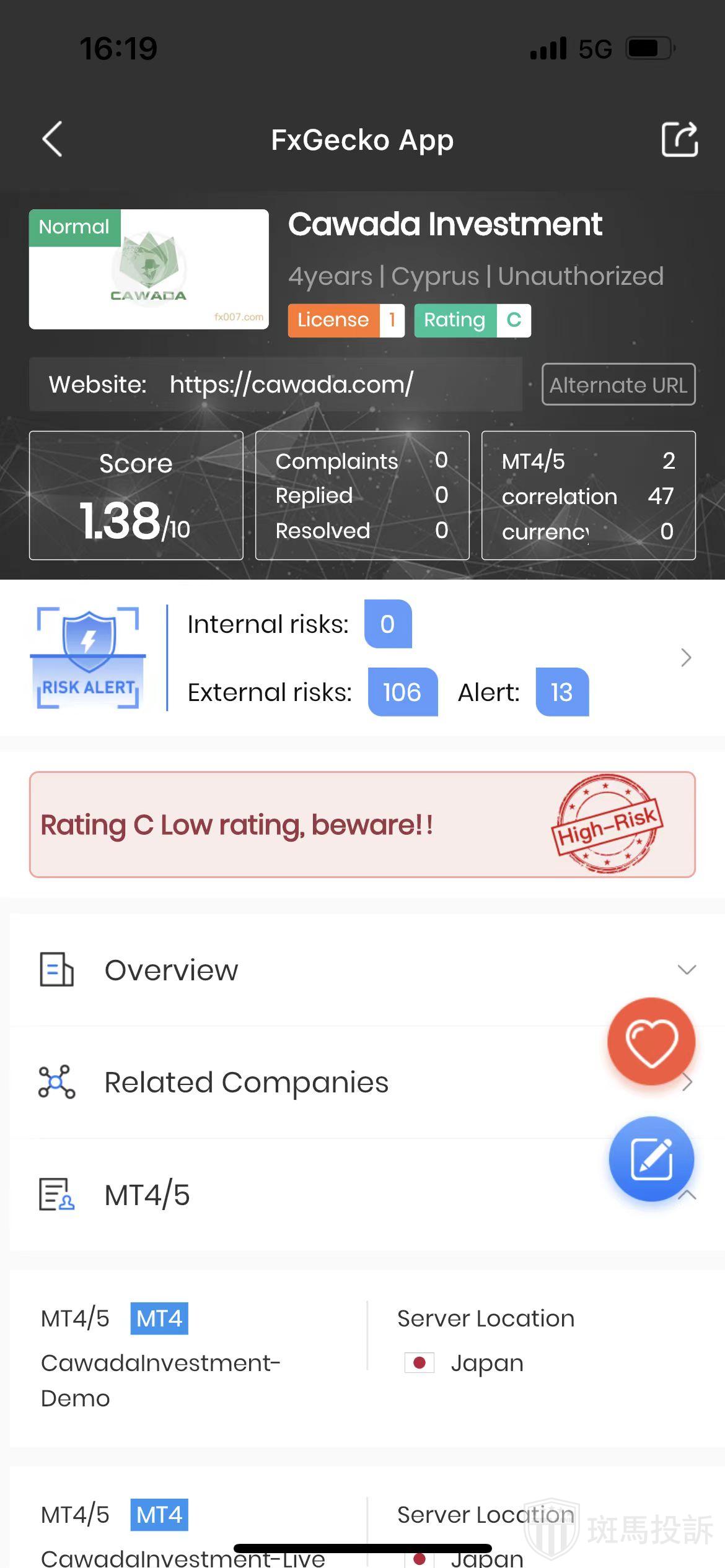FTI risk warning shows that Cawada Investment has 119 risks. Investors need to pay attention to the relevant risk alerts for this broker.