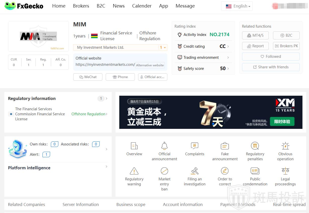 Regulatory information shows that MIM (My Investment Markets) currently only holds a license from the FSC in Mauritius. This is considered offshore regulation, which means investors' funds are not well protected. This is a major red flag, so please be very careful!