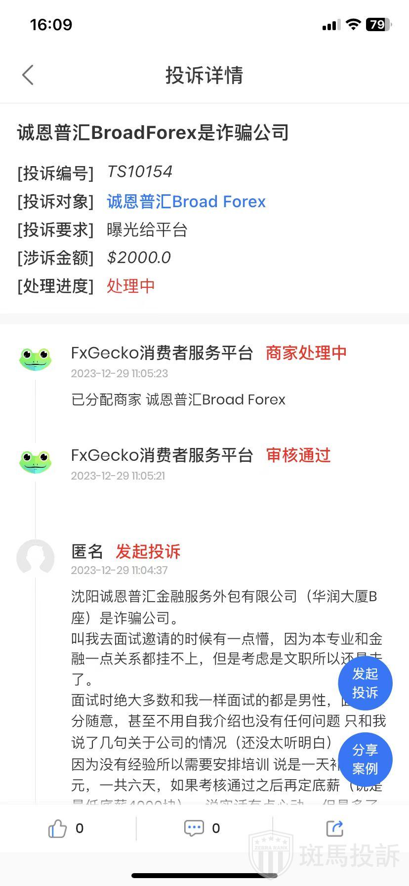 The complainant revealed: BROADFOREX (Block B, HuaRun Building) is a scam company. I was a bit confused when they invited me for an interview because my major has nothing to do with finance, but I went anyways since it's a clerical position. Most of the people interviewed, like me, were men. The interview was very casual, I didn't even have to introduce myself or answer any questions. They just told me a few things about the company (which I didn't really understand). Since I had no experience, they said they would arrange training, which would give me a daily subsidy of 100 yuan for six days. If I passed the assessment, they would then determine my base salary (which they said would be a minimum of 4000 yuan). To be honest, I was a bit tempted, but I didn't immediately agree because I was suspicious. After the interview, I looked them up online and found that their foreign exchange traders supposedly have a base salary of 8000 yuan with no responsibility, and can work from home after they are hired. Some people went there and saw that the interviews were taken by people from all ages, from the 2000s to the 70s. What kind of people are chosen for interviews? Are the thresholds for traders so low? Then came the lectures. The teacher's level was extremely low. Anyone who knows a little bit about finance can tell that the teacher is useless, just like the way they sell products to elderly people in marketing seminars. On the third day of training, they asked me to pay 2000 yuan to open an account and operate on my own in the real market. That trading software, BroadForex, is not a legitimate software; I had never heard of it before.