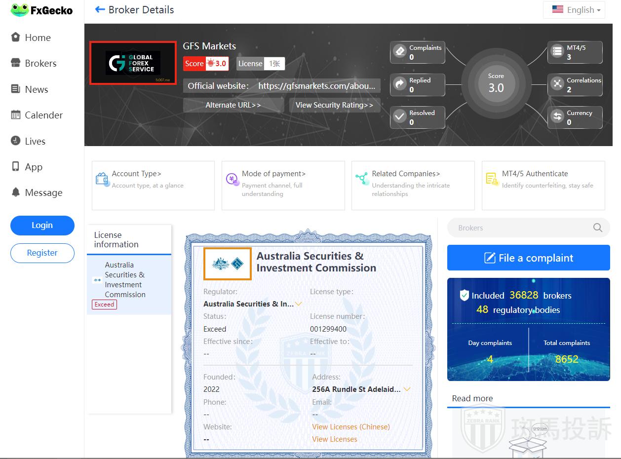 GFS Markets is regulated by ASIC in Australia, and the regulatory certificate number is 001299400, which belongs to the category of over-restricted operation.