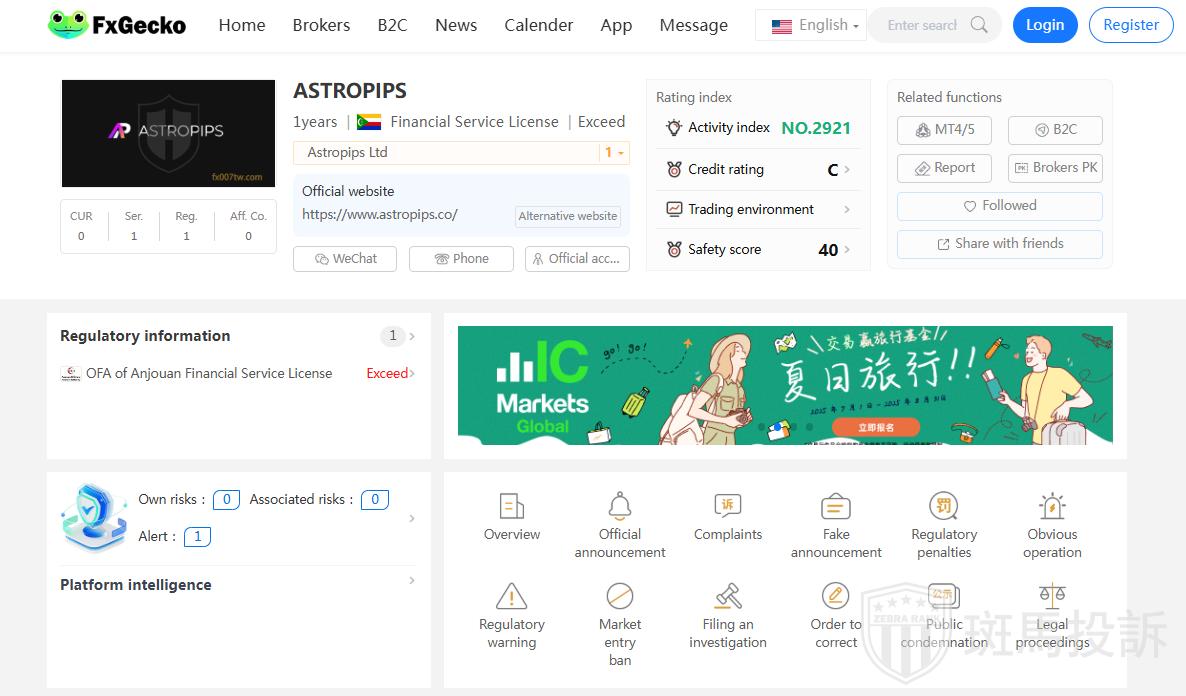 FTI risk warning shows that Astropips has 1 risks. Investors need to pay attention to the relevant risk alerts for this broker.