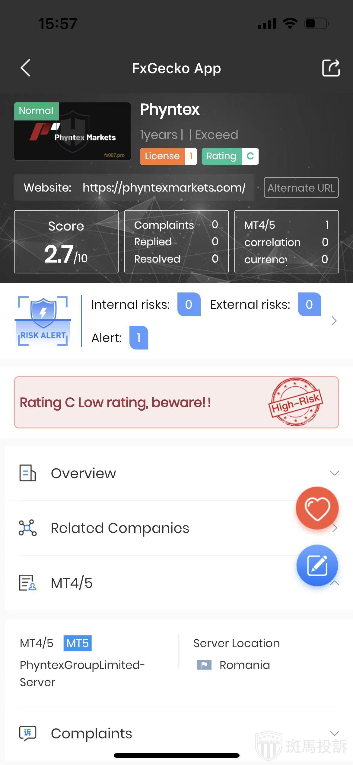 FTI risk warning shows that Phyntex has 1 risks. Investors need to pay attention to the relevant risk alerts for this broker.