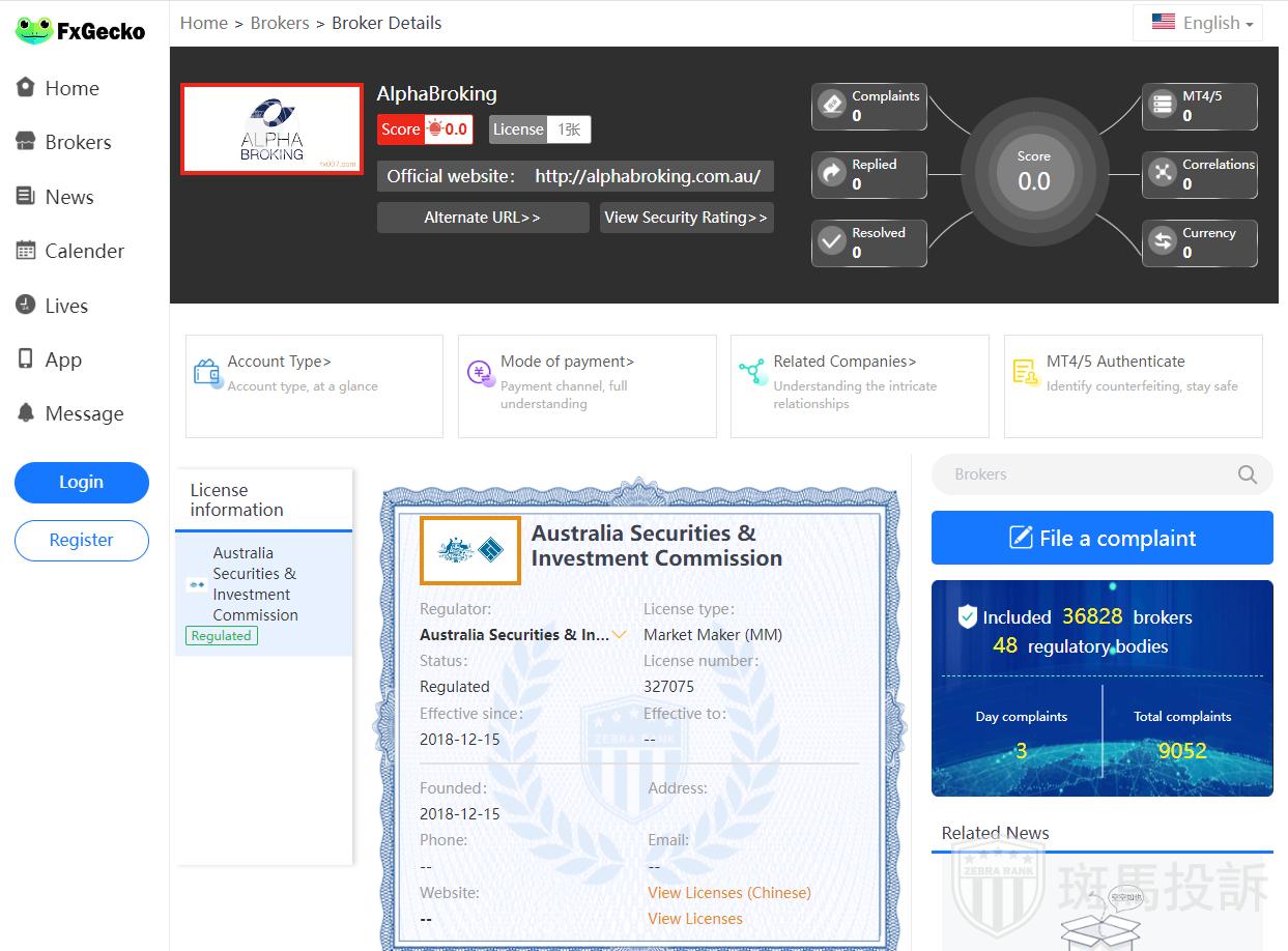 The AlphaBroking platform is regulated by ASIC Australia, the regulatory certificate number is 327075, and has obtained the MM Market Maker license.