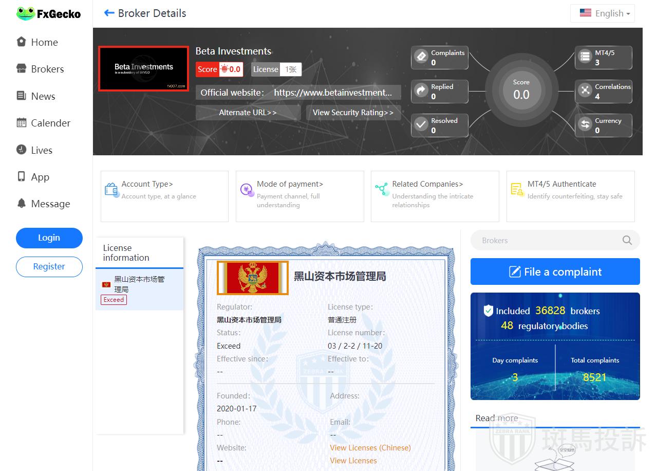Currently, no valid regulatory information has been found for Beta Investments, which is a high risk sign, beware!