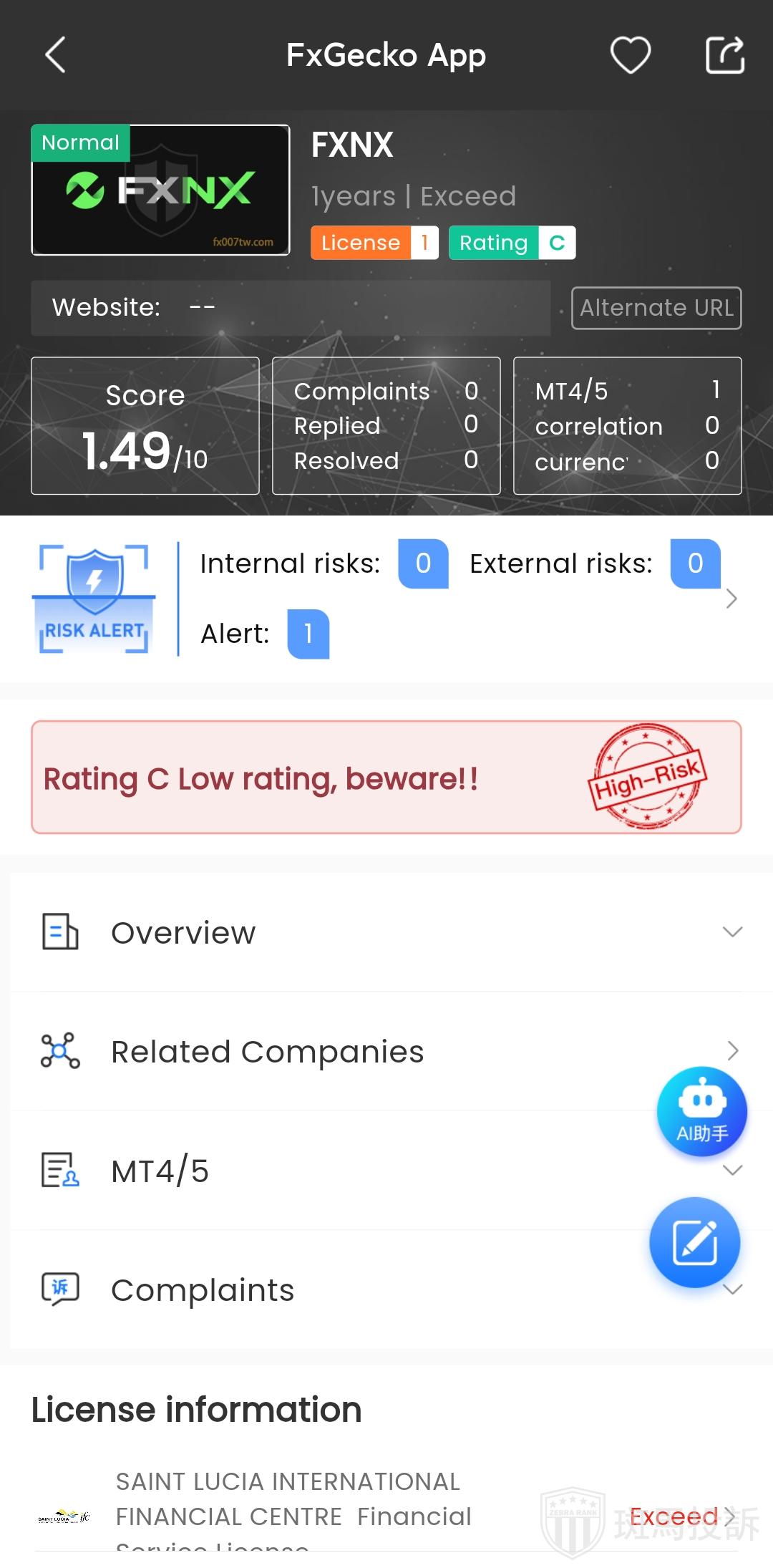 FTI risk warning shows that FXNX has 1 risks. Investors need to pay attention to the relevant risk alerts for this broker.