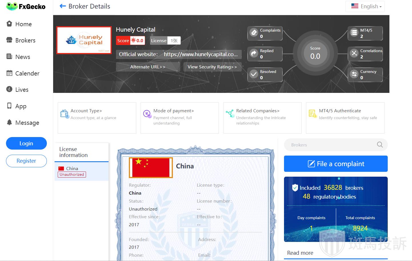 Currently, no valid regulatory information has been found for Hunely Capital, which is a high risk sign, beware!