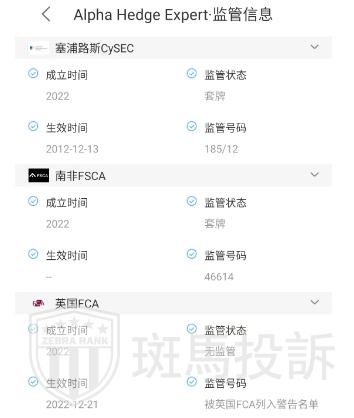 Alpha Hedge Expert平台自称在各个司法管辖区获得授权和监管。受塞浦路斯证券交易委员会监管,CIF牌照编号为185/12,并获得南非金融部门行为监管局(FSCA)的许可,FSP编号为46614。该公司还在英国金融行为监管局注册,注册号为600475。由金融行为监管局授权和监管,牌照号为777911。受伯利兹国际金融服务委员会监管,许可证号为IFSC/60/345/TS和IFSC/60/345/APM。据查询以上所称监管不仅都是套牌,还被被英国FCA列入警告名单,投资风险极大,投资需谨慎。