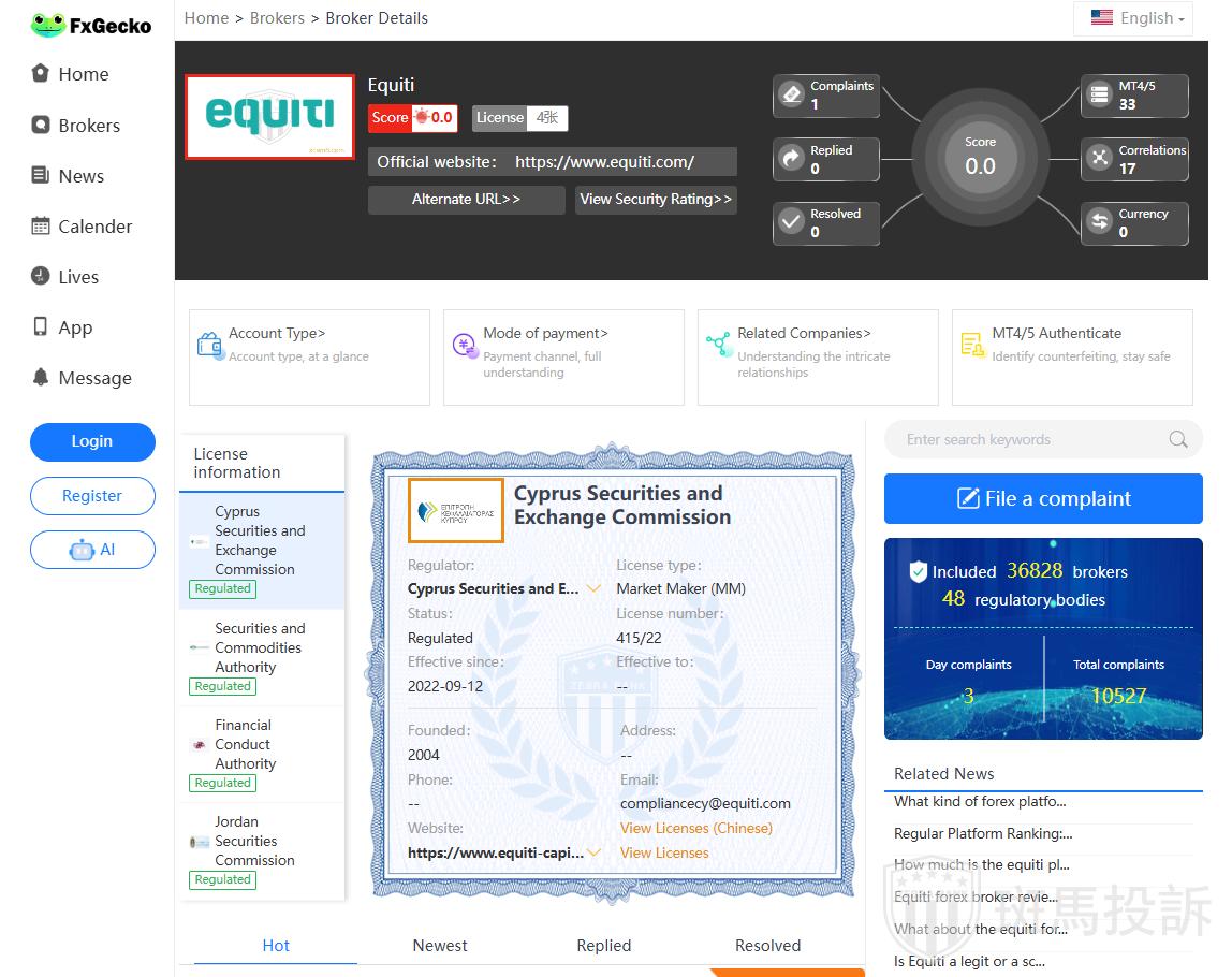 Regulatory situation: Equiti Capital is regulated by the UK's Financial Conduct Authority (FCA) and holds a number of international financial licences, including CySEC in Cyprus, SCA in the United Arab Emirates and JSC in Jordan. The existence of these regulatory bodies can effectively protect the safety of customer funds.