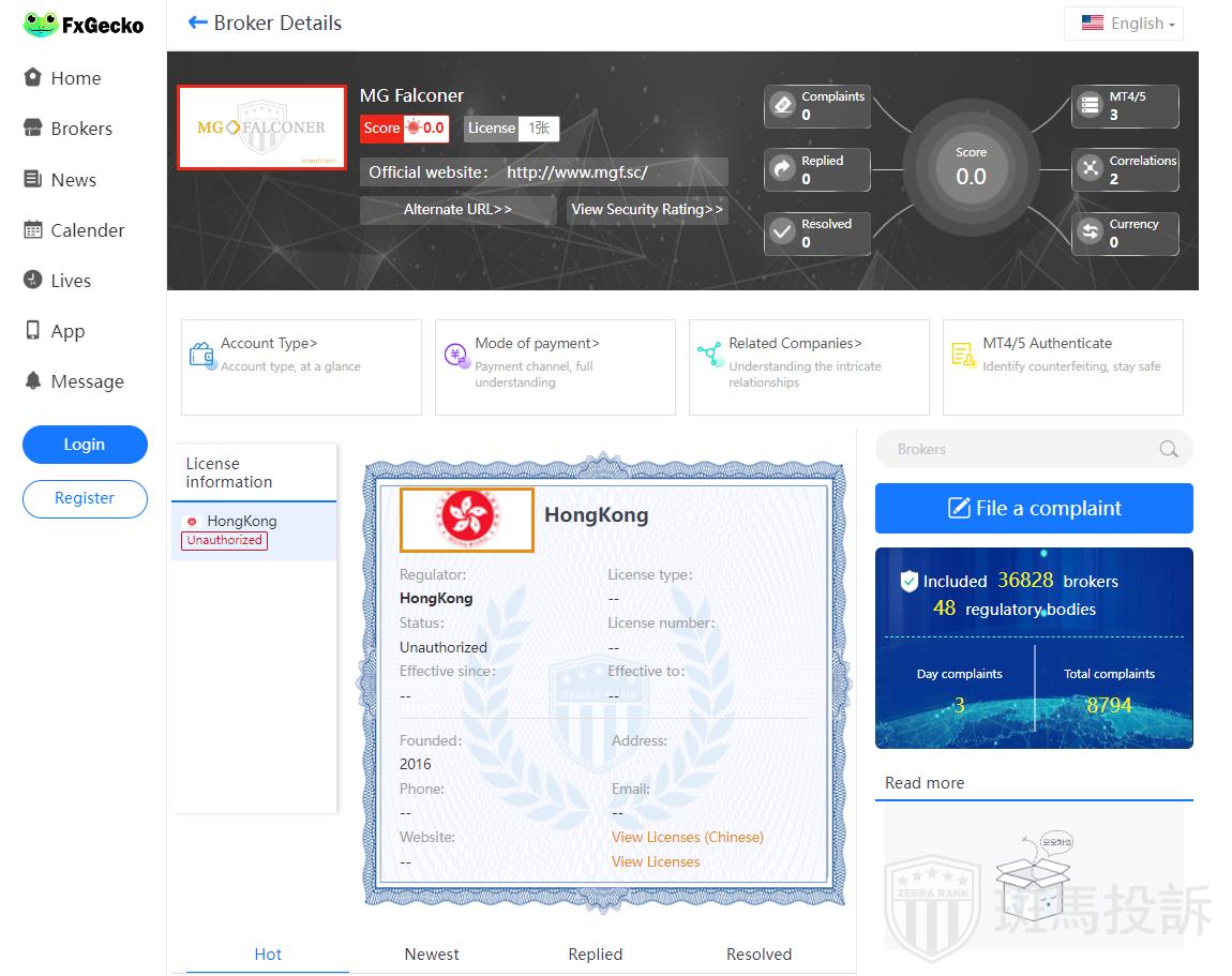 Currently, no valid regulatory information has been found for MG Falconer, which is a high risk sign, beware!