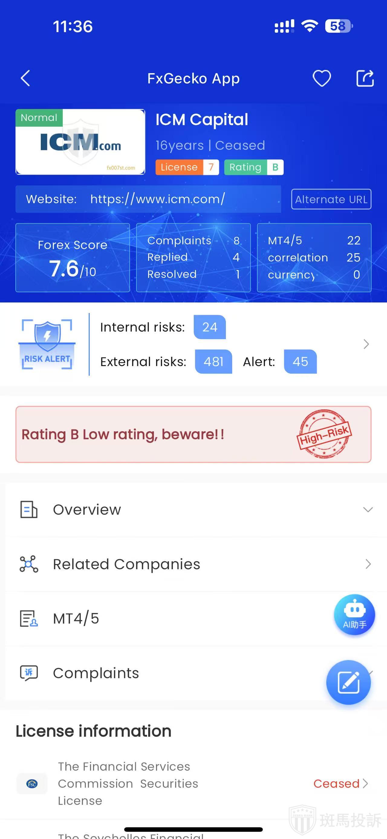 According to data from FTI, ICM Capital was established in 2009 and currently holds a global ranking of #283. Its security score is rated at 70 points out of 100. The platform claims to hold licenses from four different regulatory authorities. However, risk scanning has identified 527 alerts associated with this broker.