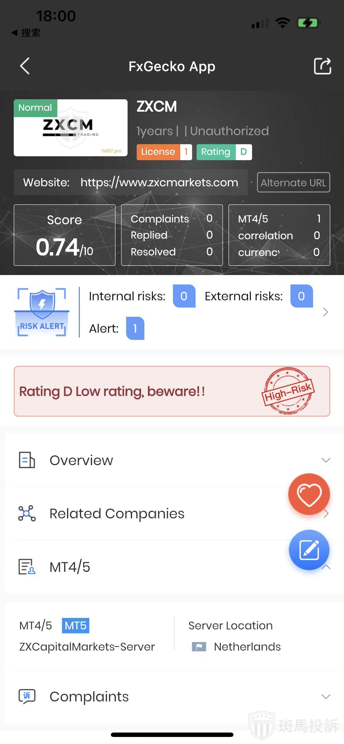 FTI risk warning shows that ZXCM has 1 risks. Investors need to pay attention to the relevant risk alerts for this broker.