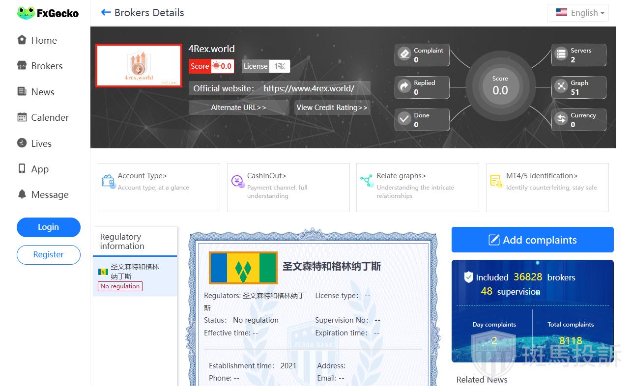 This broker is called 4Rex.world, which has been established for one year and ranks 3997 in the world. At present, there are 0 foreign exchange licenses, and the risk scan shows 3 risks. Investors need to pay attention to relevant risks.