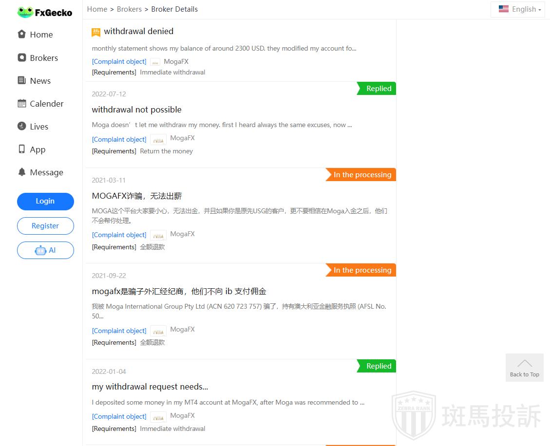 Serious problems with withdrawals: the MogaFX platform has serious problems with withdrawals. fxGecko shows that the platform has received 26 complaints, which are basically related to the platform's inability to make withdrawals.