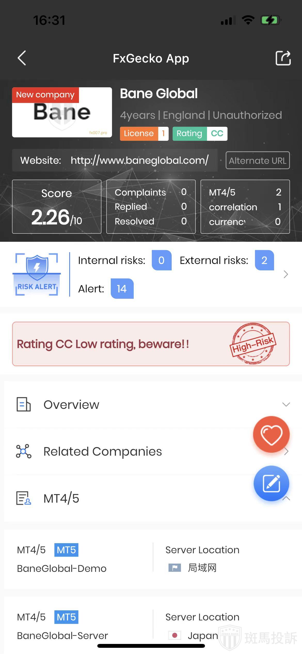 FTI risk warning shows that Bane Global has 16 risks. Investors need to pay attention to the relevant risk alerts for this broker.