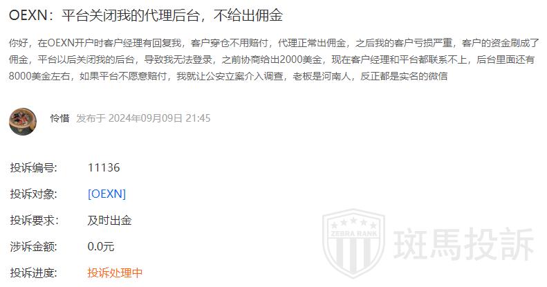 Complainant's Disclosure: Greetings, during the account opening process with OEXN, my account manager assured me that clients would not be liable for negative balances (margin calls), and agents would receive commissions as usual. Subsequently, my clients suffered significant losses, resulting in their funds essentially being converted into commissions. To my surprise, the platform subsequently closed my back-end access, preventing me from logging in. Previously, the collaborator gave me $2000, but now the account manager and platform cannot be contacted, and there is still about $8000 in the backend.
