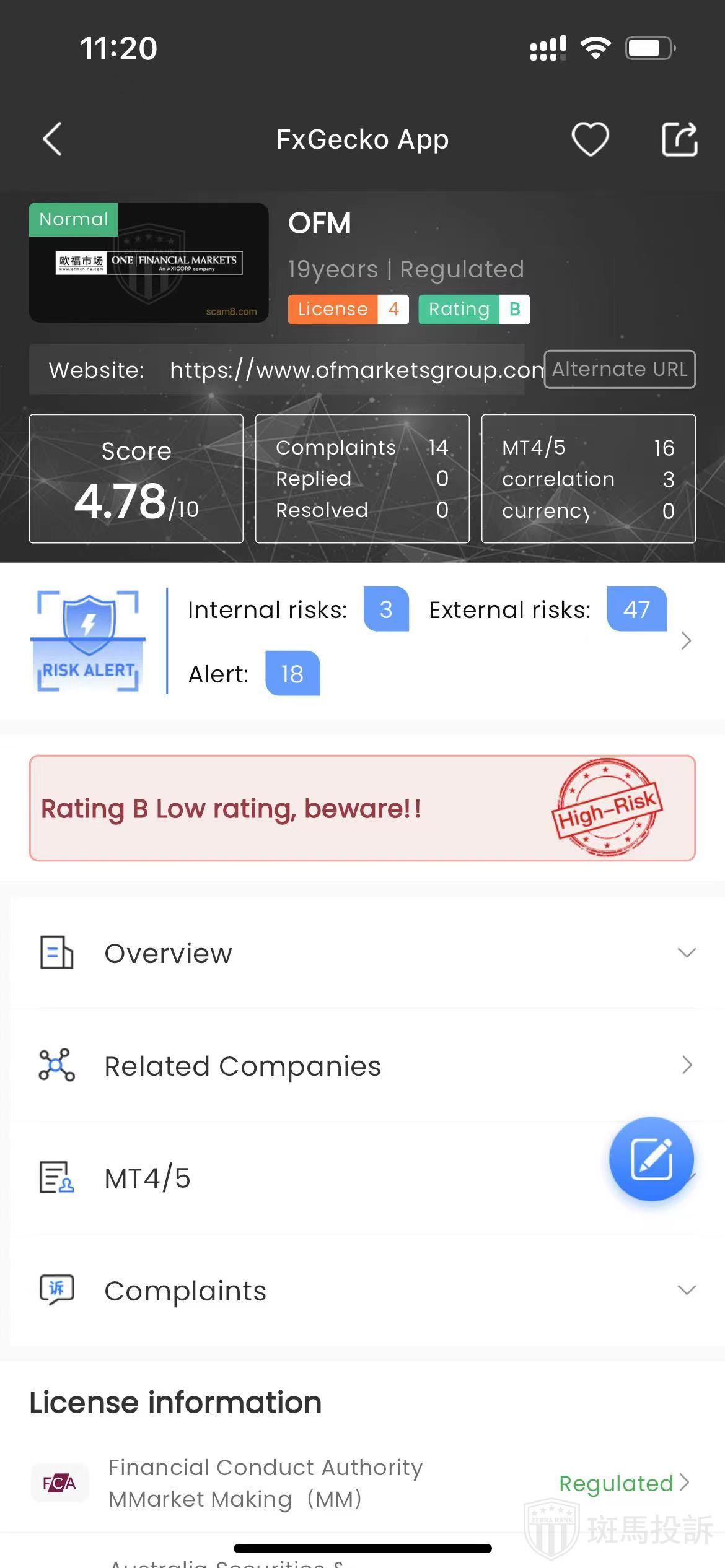 According to FTI's records, the platform called OFM was established in 2006 and ranks 235th globally with a safety score of 70. The platform claims to hold regulatory licenses from four countries and has 68 risk scan alerts.