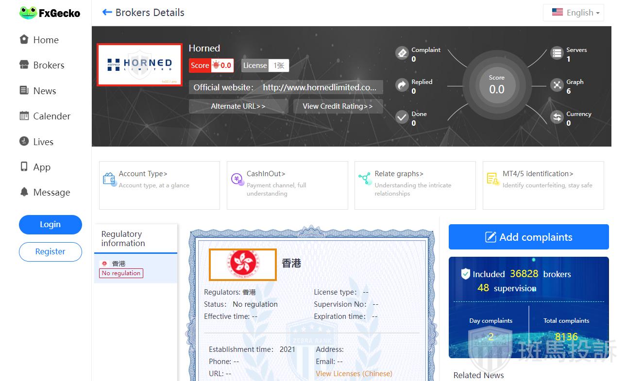 This broker is called Horned, which has been established for one year and ranks 4168 in the world. At present, there are 0 foreign exchange license, and the risk scan shows 2 risks. Investors need to pay attention to relevant risks.