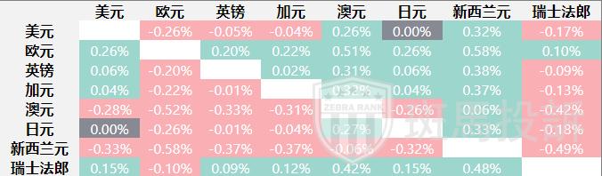 热图显示了主要货币之间的百分比变化。基准货币从左列中选择,报价货币从顶行中选择。例如,如果您从左列选择欧元,然后沿水平线移动到日元,方框中显示的百分比变化将代表欧元(基准)/日元(报价)。
