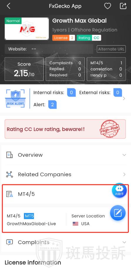 FTI risk warning shows that Growth Max Global has 2 risks. Investors need to pay attention to the relevant risk alerts for this broker.