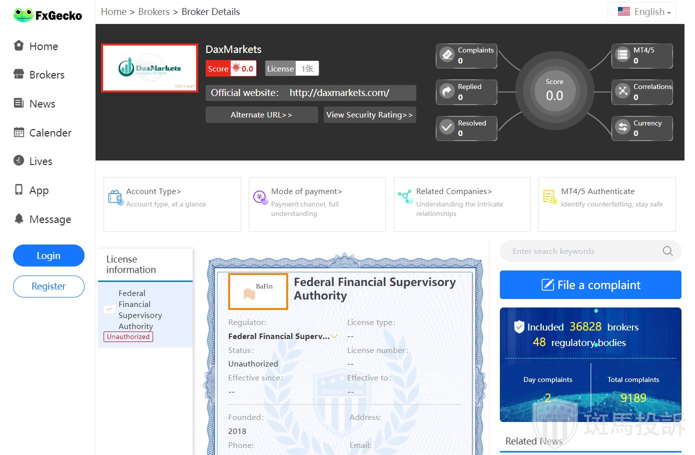 Currently, no valid regulatory information has been found for DaxMarkets, which is a high risk sign, beware!