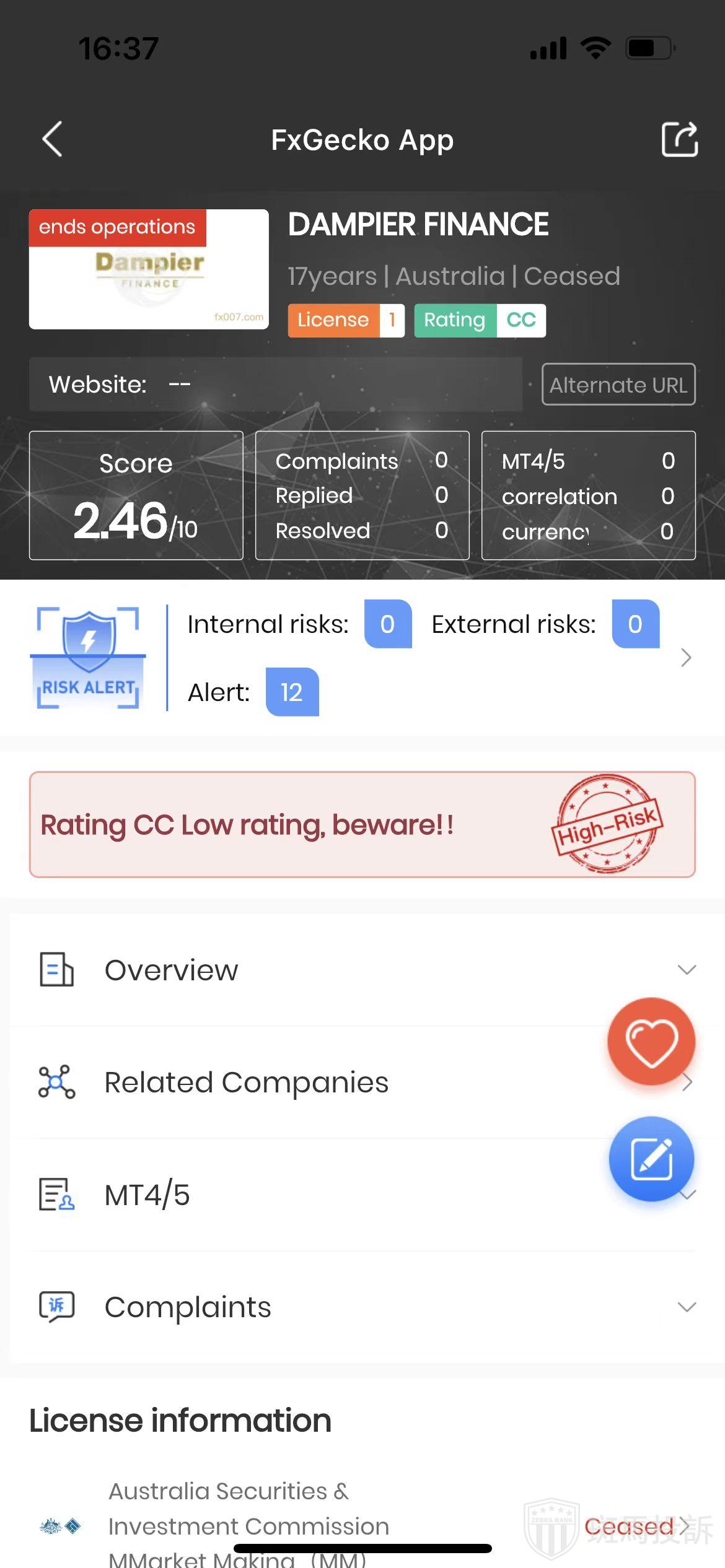 FTI risk warning shows that DAMPIER FINANCE has 12 risks. Investors need to pay attention to the relevant risk alerts for this broker.
