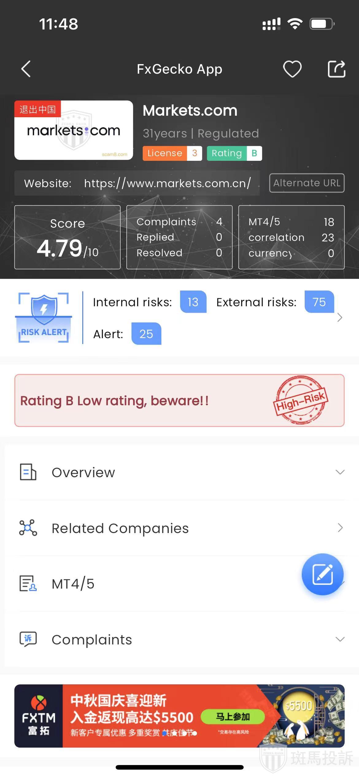 **FTI's Comprehensive Review:** Considering the establishment time, regulation, and the relationship between the main brand and white-label partners, Markets.com appears to be a decent choice. However, if you are a Chinese investor and someone strongly recommends the Markets.com platform, be very cautious. Industry insiders know that as early as 2018, Markets.com announced it would no longer provide forex trading services to Chinese residents, nor support opening accounts or deposits. Up until now, Markets.com has exited the Chinese market for several years; however, during this period, there have been continuous imitations of Markets.com. Please be discerning and do not easily believe others' words. Invest prudently!